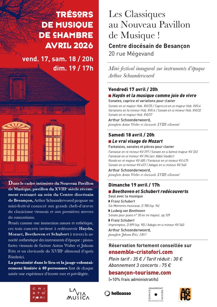 Dans le cadre intimiste du Pavillon de Musique du XVIIIe siècle, récemment restauré au sein du Centre diocésain de Besançon, Arthur Schoonderwoerd propose un mini-festival consacré aux grands chefs-d’oeuvre du classicisme viennois et aux premières oeuvres du romantisme.